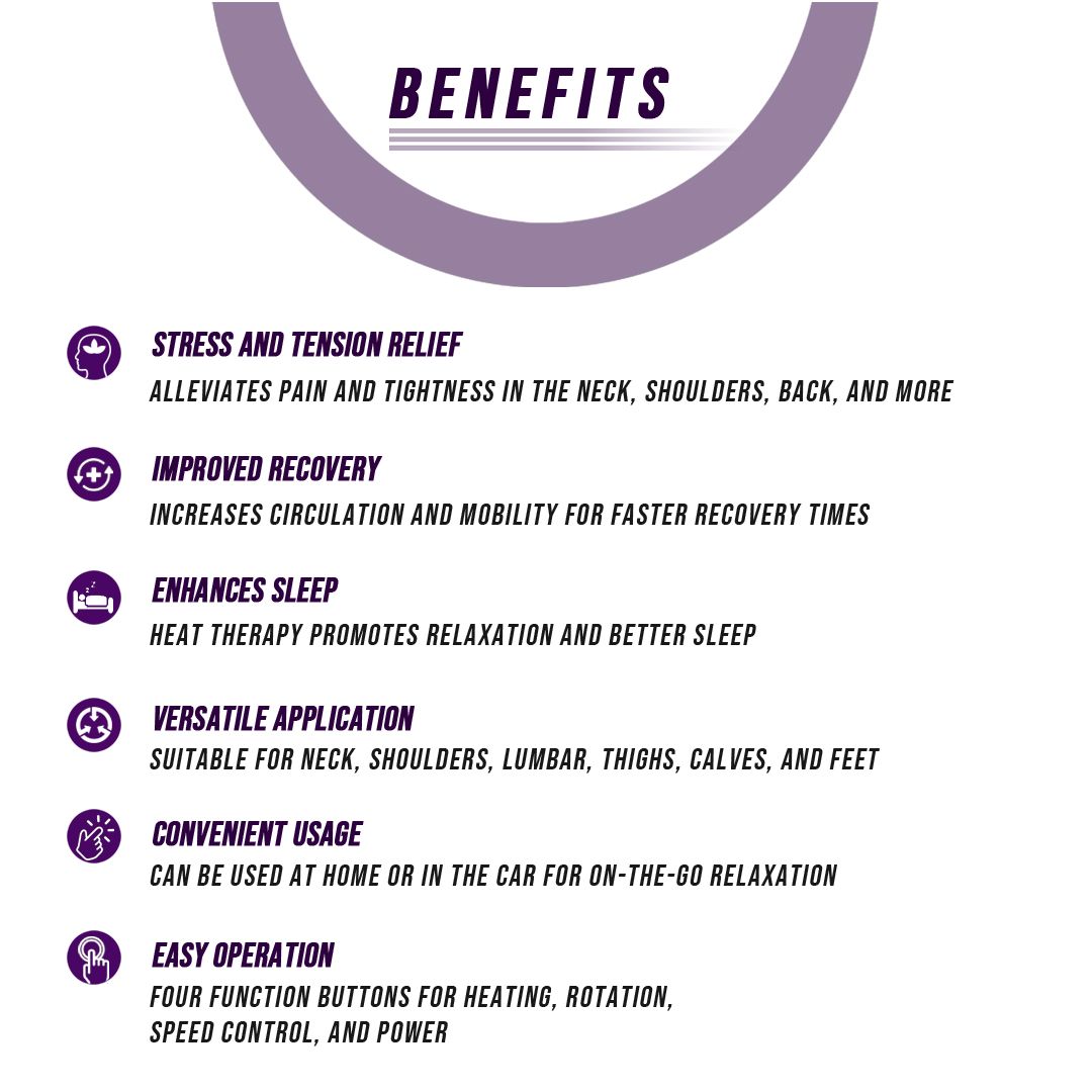 <p>Not only does it help to relieve stress and tension, but it also aids in improving recovery times. Using bi-directional movement that mimics the feeling of a personal massage, this massager helps increase circulation for improved mobility. The heat therapy feature also helps to promote better sleep.</p>